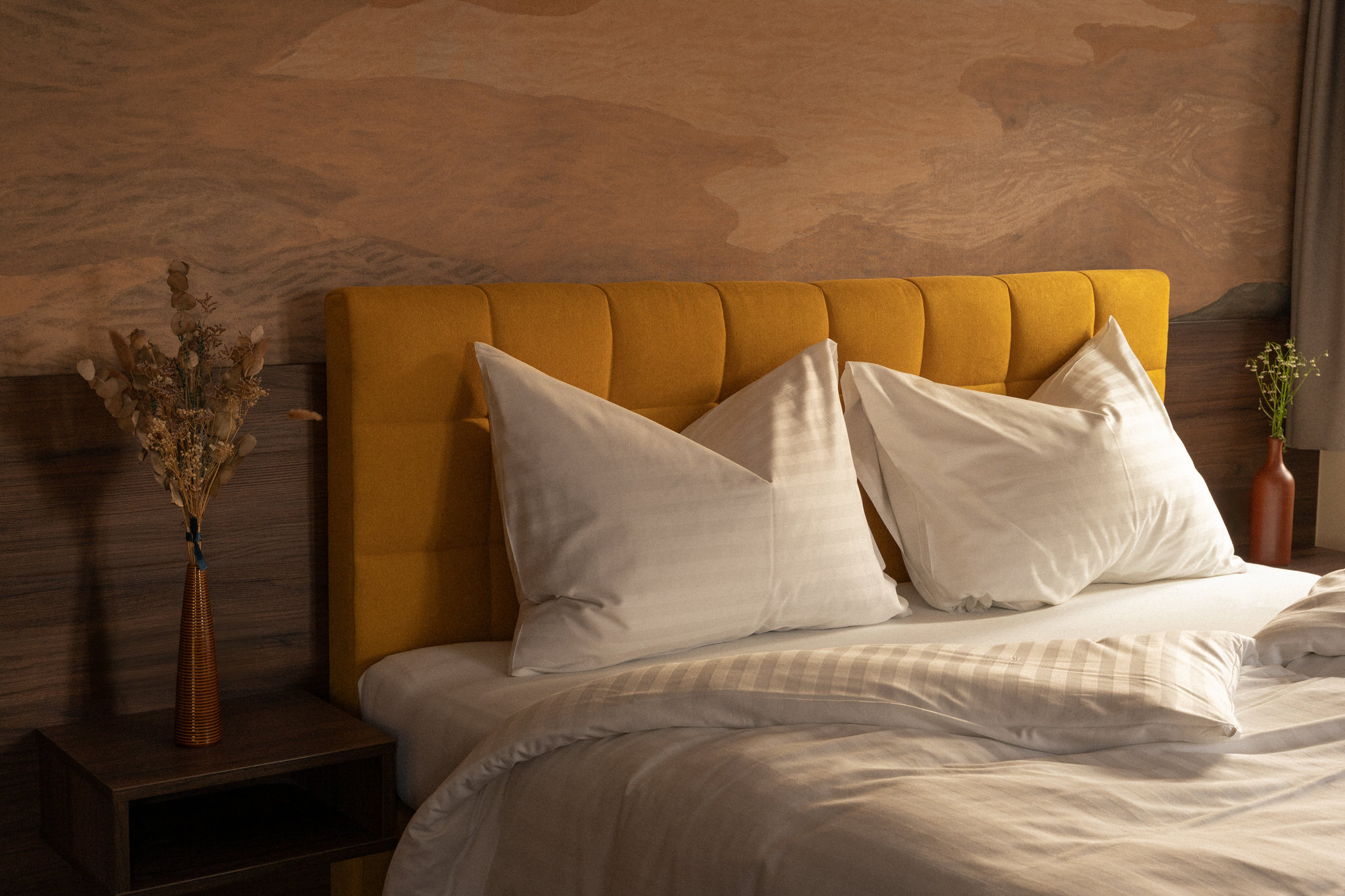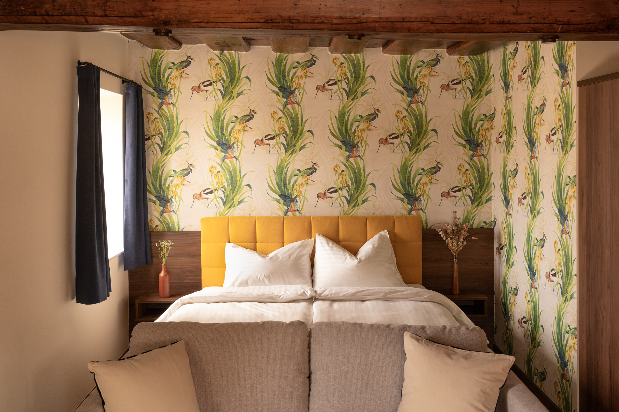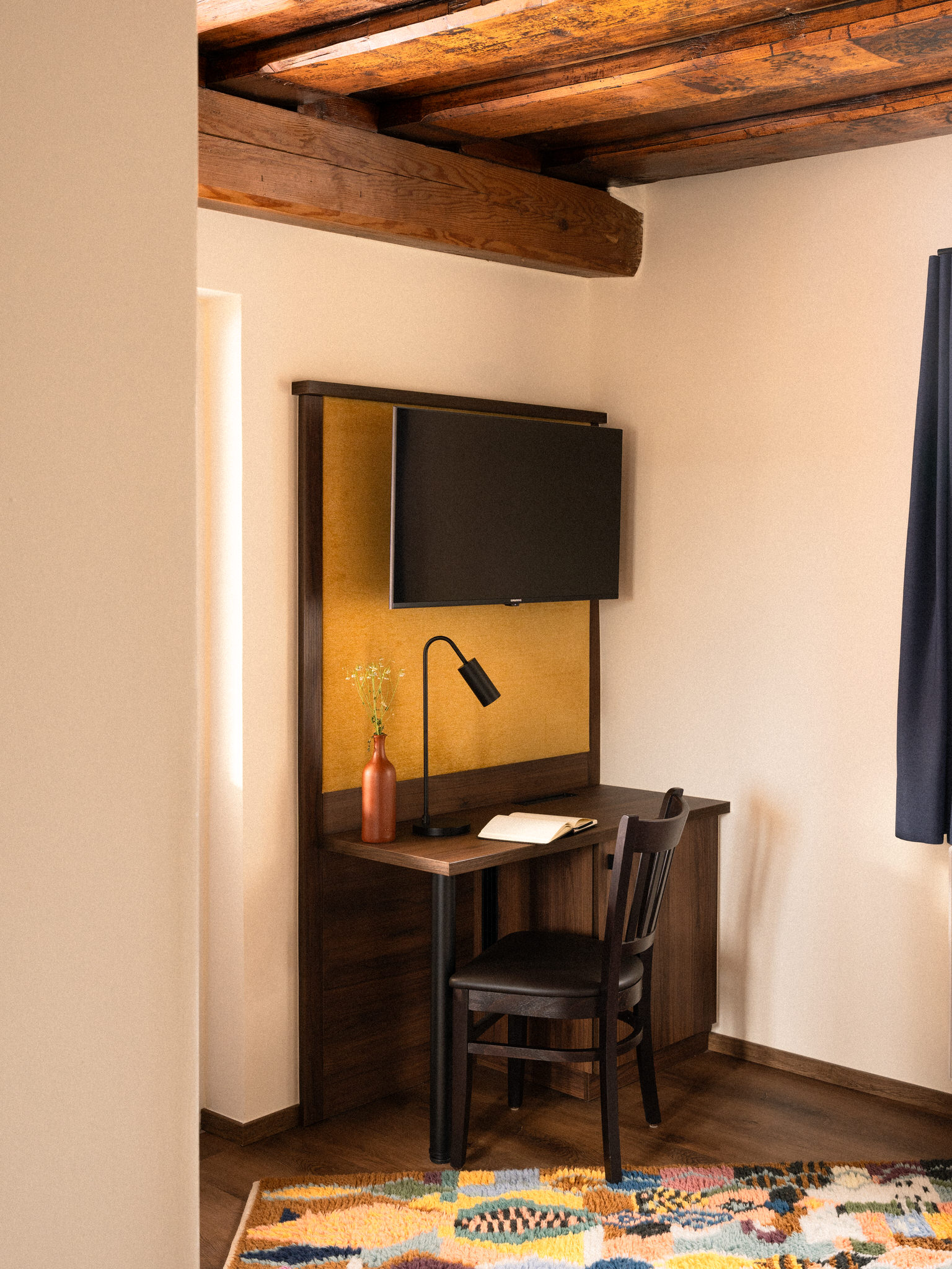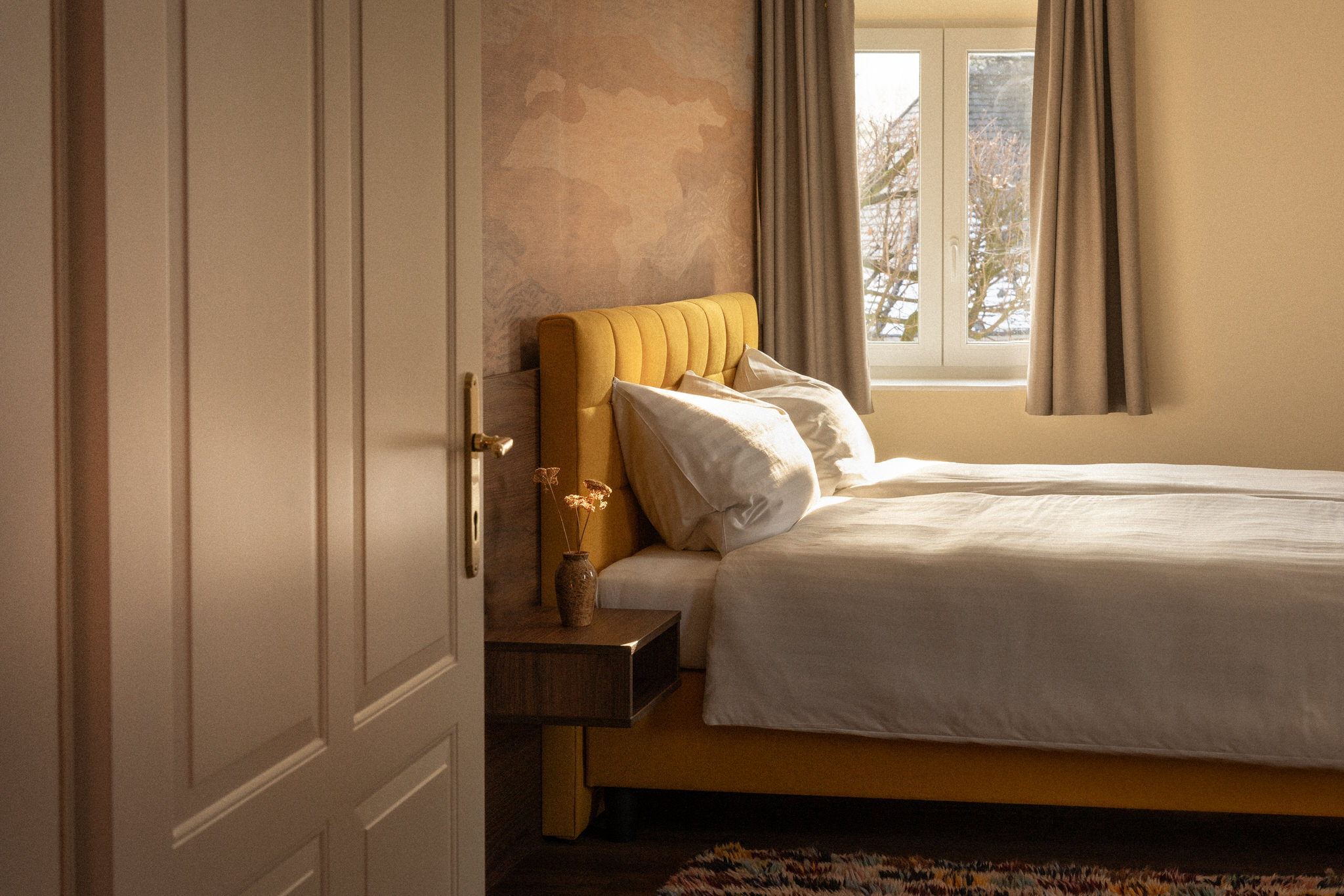 Exklusives Doppelzimmer Deluxe (ca. 35 m²) mit stilvoller Einrichtung und hochwertigen Materialien. Das elegante Design und die besondere Atmosphäre machen den Aufenthalt besonders angenehm. Genießen Sie den malerischen Ausblick auf den Dorfplatz. Ausgestattet mit Dusche, TV und Kühlschrank. Ideal für 2 Personen, buchbar ab 3 Nächten.